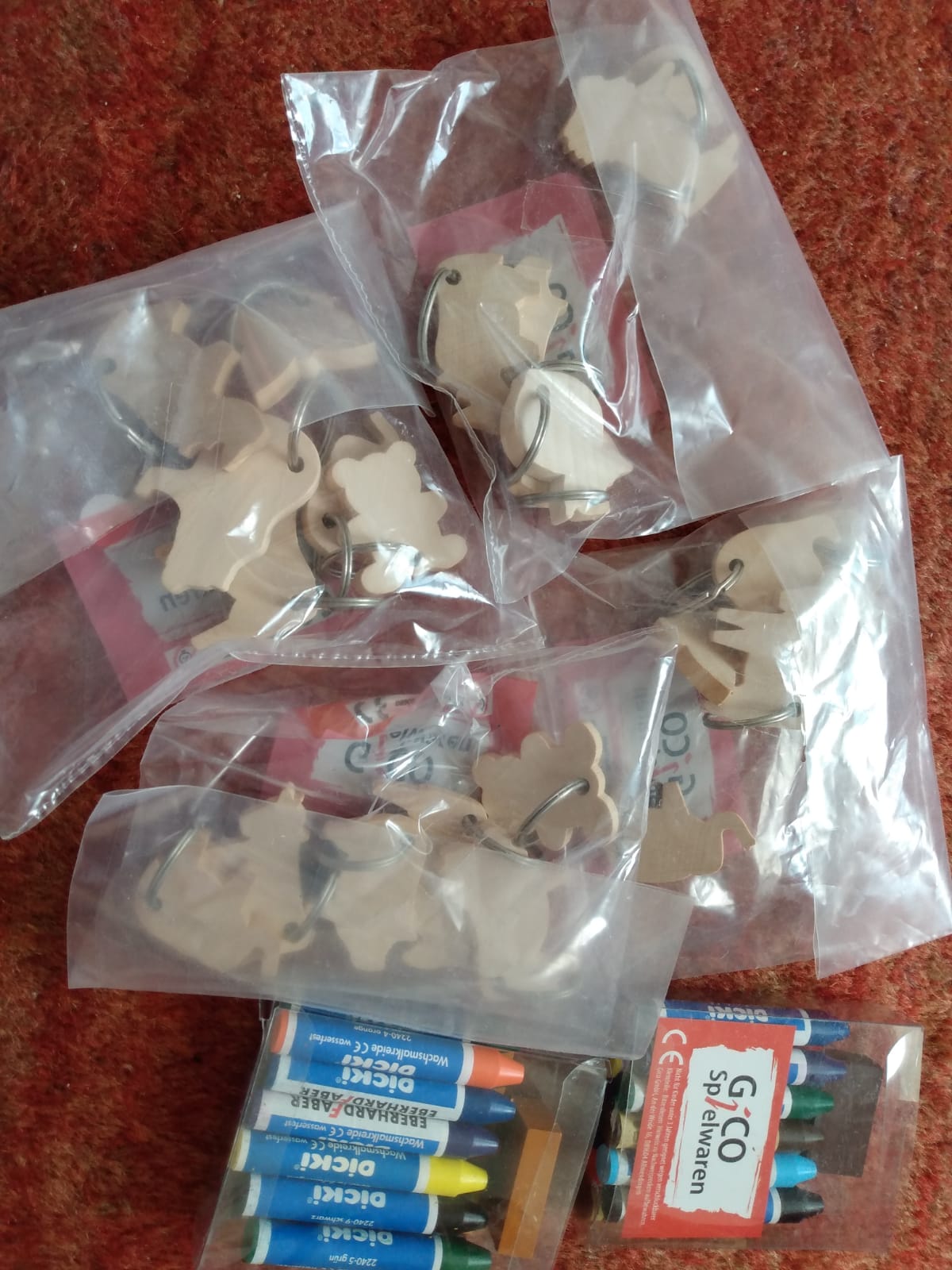 24 Schlüsselanhänger zum selbst bemalen und 2 Pakete Wachsmalstifte